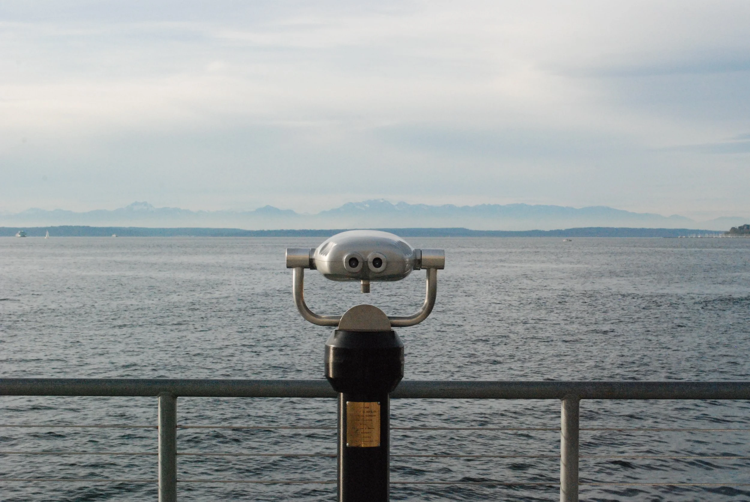 Photo taken on pier 57 in seattle looking at the stationary binoculars directed toward the Olympic mountains.
