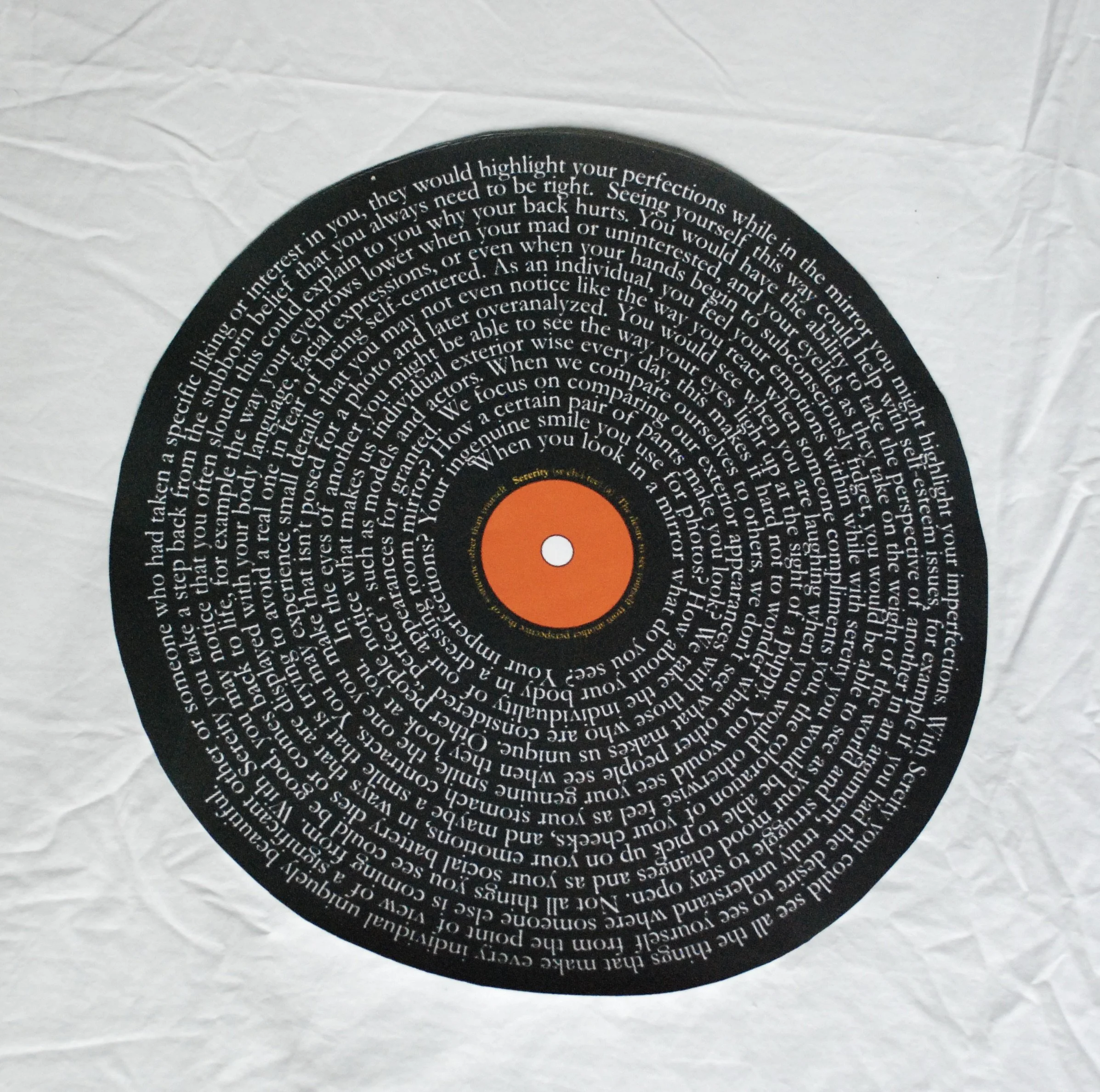 In response to a prompt to create a new word, Sererity was created to express desire to see yourself from other perspectives and have greater self-love. This piece is in the form of a record to grab the viewers attention.