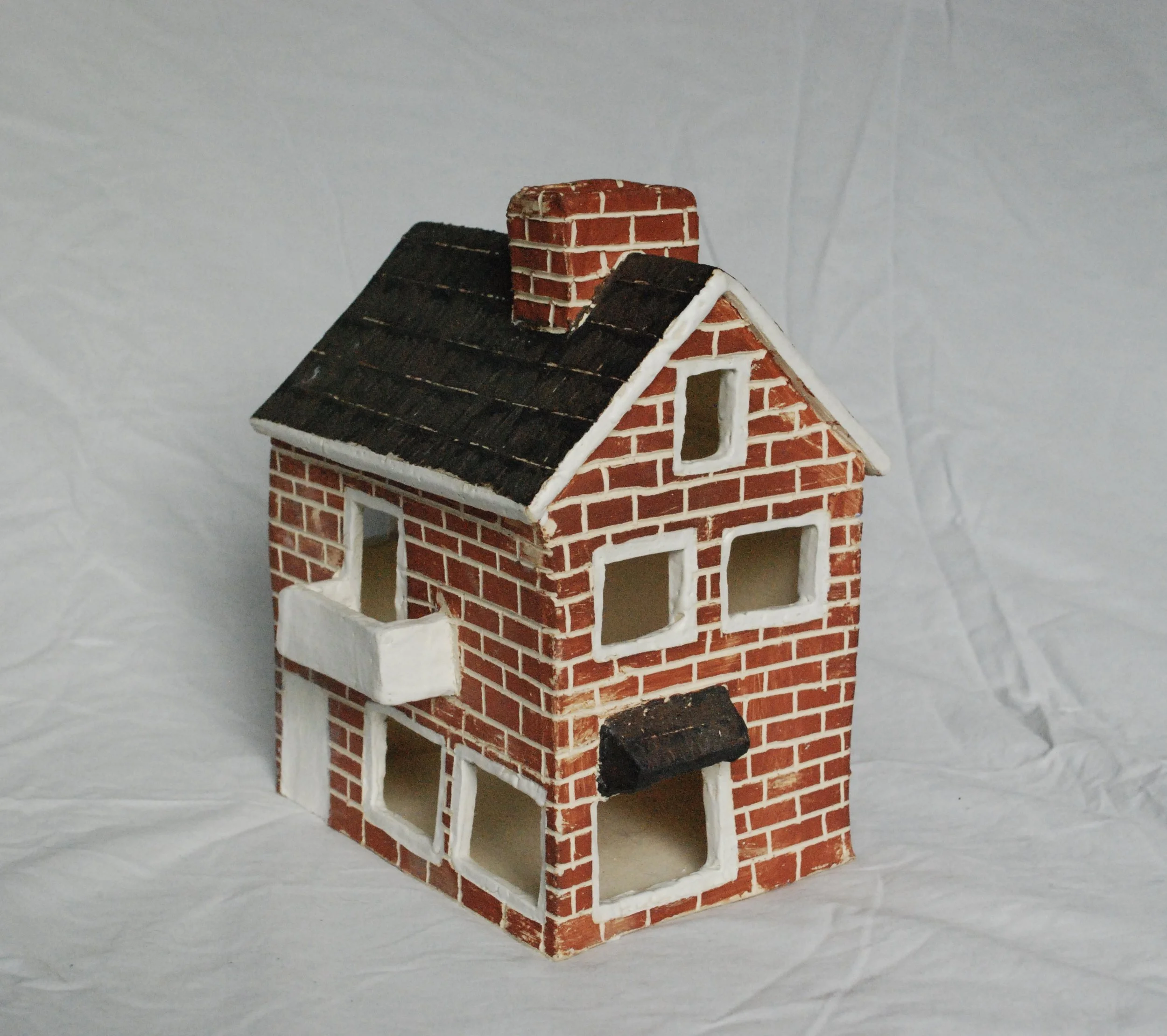 This model was made to replicate my mother’s very first home in Holland. I connected 7 slabs, used red underglaze to carve realistic bricks and glazed the window sills to give them a shiny finish after the first firing.